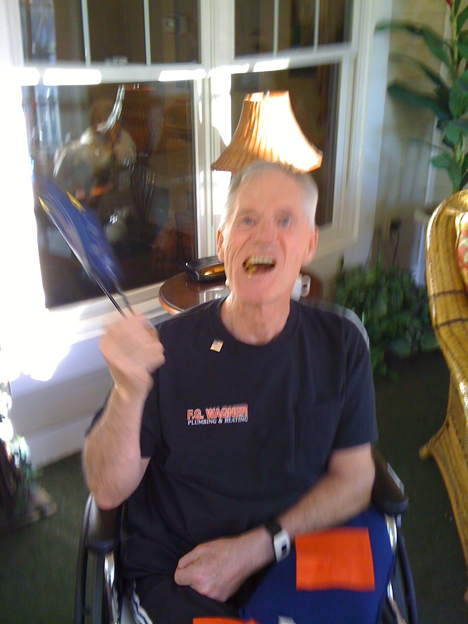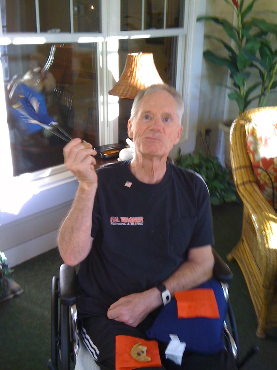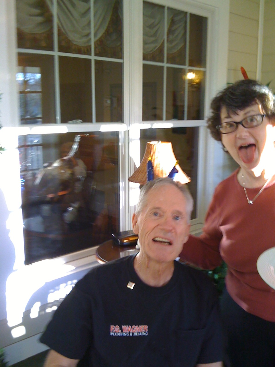 Anyway, I had a wonderful day yesterday with my Madrasta and my father. I was able to be there during his OT time. My Dad is such an overachiever, even in his recovery from the stroke!! We had lunch with him and then he laid down for a nap. We came back and got him up to go the Veteran’s Day social. We watched a video and then went downstairs for fruit, cookies, and coffee. Dad wanted to sit in the sun, so we took him out onto the inside porch. Now, you would think that on such a dignified day I could get a serious picture of Dad and Netta! But noooooooooooooooooo….I guess Dad was paying me back for all the parents out there who try to take family pictures when the kids are little and they inevitably end up with a photo of someone sticking a tongue out or a finger up a nose. You will notice the mischieveous grin on my Dad’s face in the first pic! I should have known something was up!