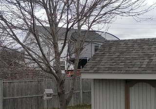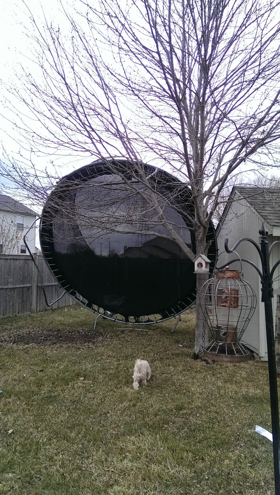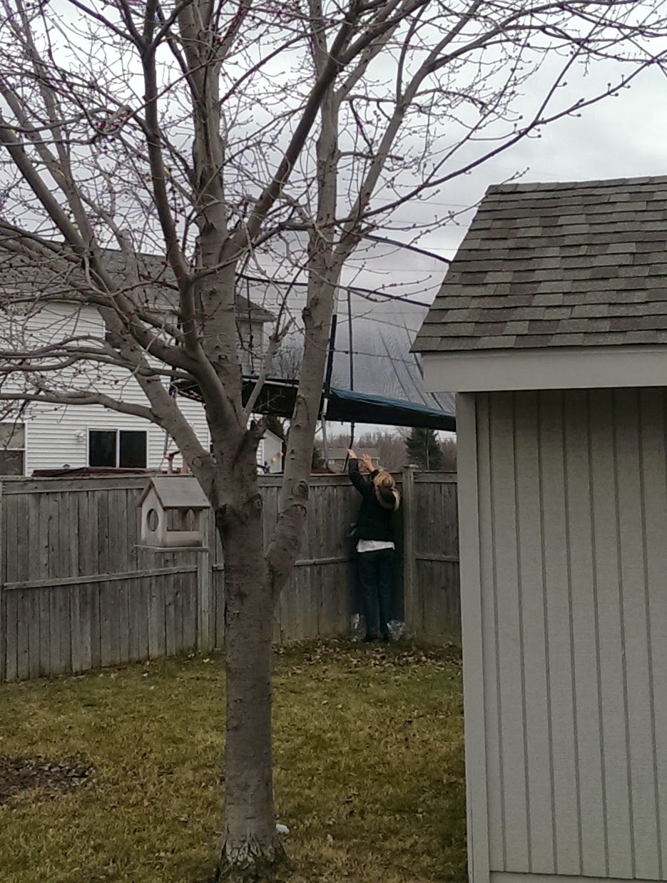 One windy morning we woke up to find that we had inherited a trampoline! I was given many suggestions on how fun it would be to have, but alas within a couple of hours the neighbors came to retrieve it. It had flown over the fences and nestled up against one of our trees and the shed. It was quite interesting watching them trying to get it up on the fence and back over with the wind fighting their every move!